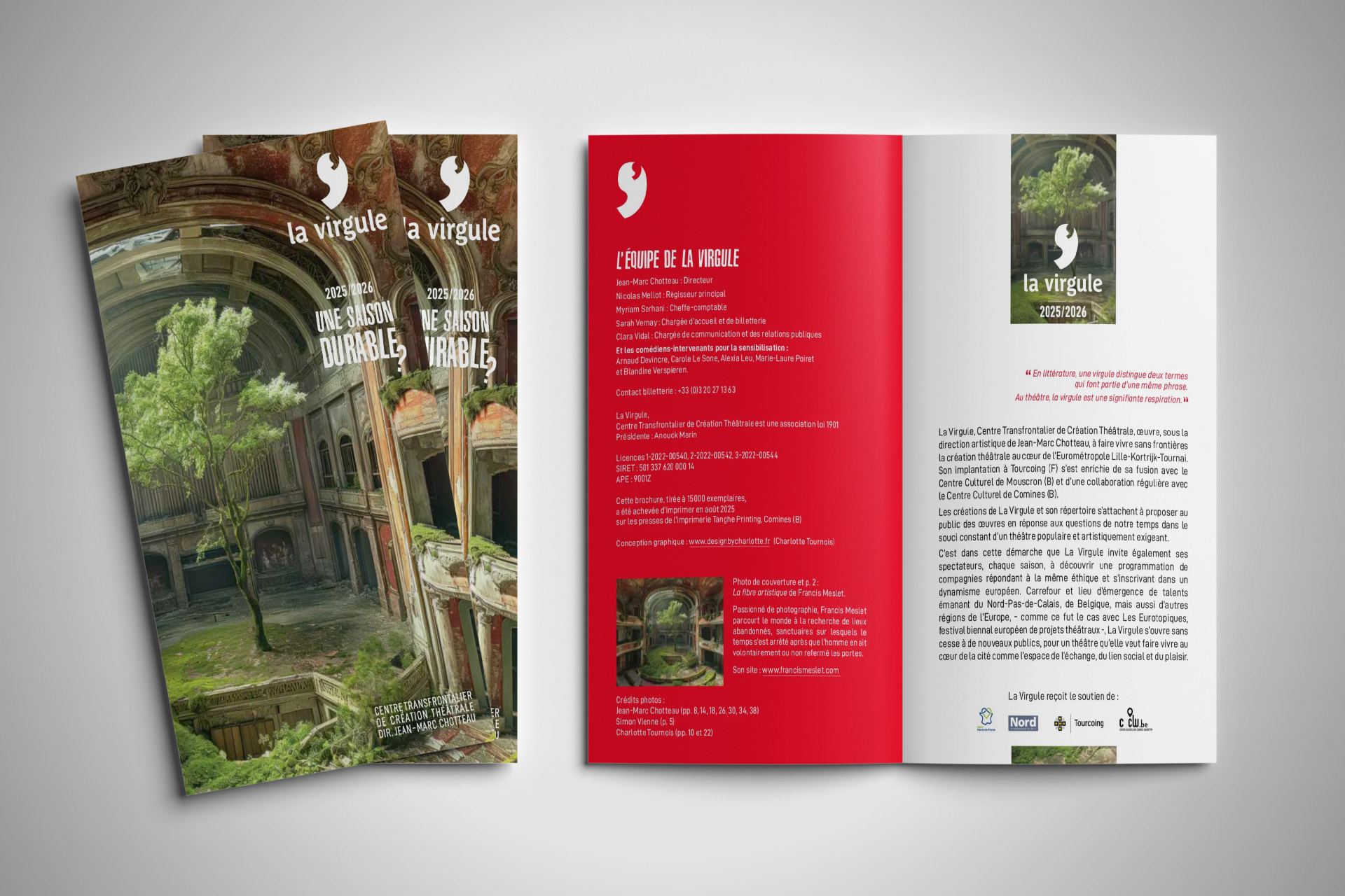 Alors quoi donc de durable dans les saisons que La Virgule vous propose ? Depuis 35 saisons nous travaillons à en mériter l’adjectif. Et particulièrement encore pour celle que je vous annonce ici. Retournez un instant sur la photo de couverture ! Je vous en propose une autre lecture : on y voit, sur la scène au toit défoncé, passer suffisamment de lumière pour qu’un bel arbre y ait poussé. Une petite graine s’est défiée du chaos ambiant. Peut-être même s’en est-elle nourrie ? Et si c’était cela le "durable" d’une saison théâtrale ? Quelque chose qui pousse encore, la représentation terminale ? Le "durable" des saisons proposées par La Virgule est le fruit de sa volonté tenace de continuer à vous proposer un théâtre dont le fil rouge est un engagement artistique, une philosophie, une éthique, comme le dit au milieu de la scène cet arbre puissant que l’empreinte dans l’air des spectacles passés fait grandir encore et encore.